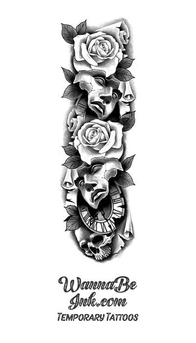 Modern Roses And Broken Statues With Clock And Skulls Temporary Sleeve Tattoos Wannabeink Com